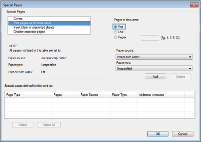 Modify the setting options in the Print pages on different paper or Special Pages dialog box.