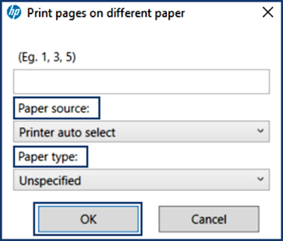 Select the applicable options from the Paper source and Paper type drop-down lists, and then click OK.