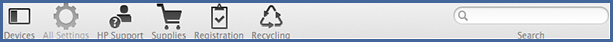 The HP Utility toolbar allows you to access information about your printer, settings, HP Support, supplies, registration, recycling, and product improvement.