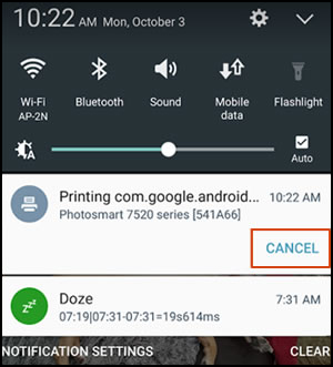 Cancel a print job: On your Android device, swipe down from the top to view your current print jobs. Select the print job you want to cancel, and then tap Cancel.